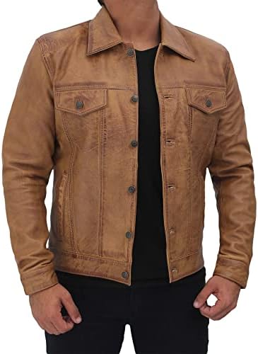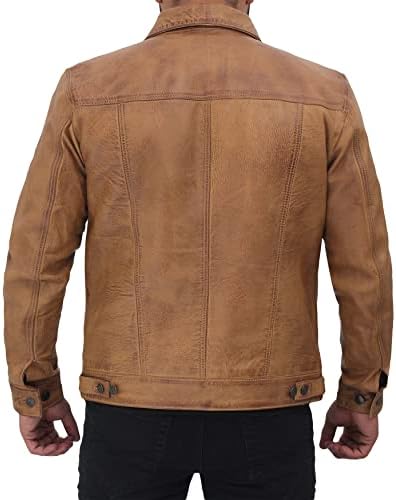 The Decrum trucker Brown Leather Jacket is very cool but not distressed like it shows in the picture, so I used A sponge with a yellow sponge side and a green abrasive scour pad on the other side. The leather is very soft so it doesn’t take much pressure on the jacket to make it look distressed. I am male about 200lbs 6’1 muscular build I bought An Xlarge and the sleeves were a bit too long so I put it in the washing machine on light cycle and then put it in the dryer on light dry this is…